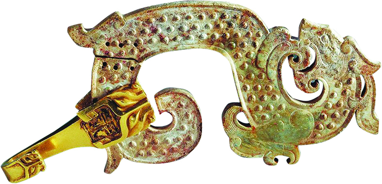 虎头金钩扣龙形玉佩应产于西汉(公元前202年-公元8年),于1983年在象岗南越王墓出土,当时于广州南越王墓墓主人赵眜的右肩上发现,原本龙形玉佩下半端被折断,但主人并没有舍弃它,而是将它修复后赋予了它新的生命——带钩。