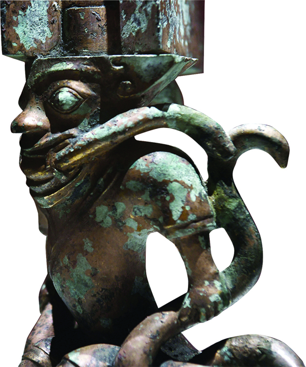 结构分上下两部分:上半部为两个大小相同的扁长方套筒组成的活页,可作90度展开,为屏风右翼障的下转角构件。下半部为力士托座,取自“越人操蛇”的传说。力士身着右衽褐衣,短裤,跣足。两眼圆瞪,眼珠外突,口咬一两头蛇。双手操蛇,双足跪坐夹蛇,五条蛇相互绞缠,纹饰玲珑通透,是两千多年前越人抓蛇吃蛇形象的再现。原通体鎏金,并有黑漆绘线,现仅留斑点。