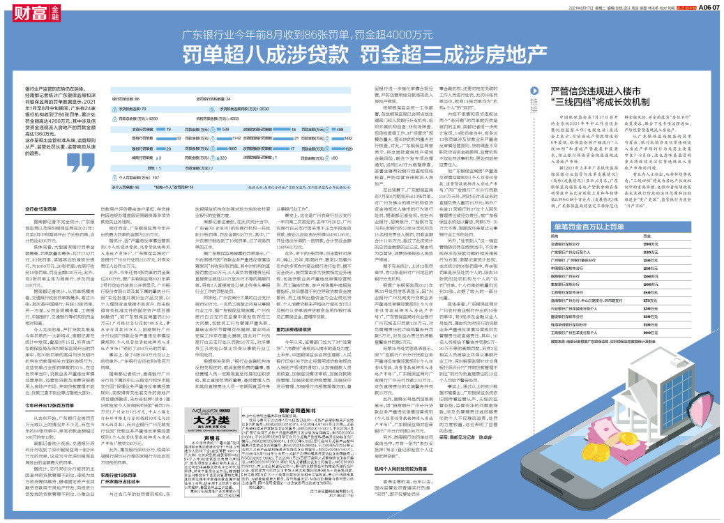 银行业严监管的态势仍在延续。 经南都记者统计广东银保监局和深圳银保监局的罚单数据显示,2021年1月至8月中旬期间,广东有24家银行机构收到了86张罚单,累计处罚金额高达4200万元,其中涉及信