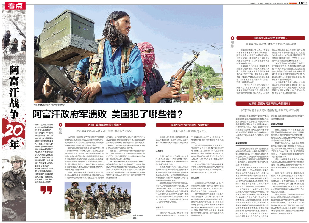 阿富汗塔利班15日兵不血刃占领首都喀布尔,宣告“战争结束”。自2001年“9·11”恐怖袭击后美国主导入侵阿富汗以来,美国就在阿富汗的国防领域投入了近830亿美元。北约到目前为止已经向阿富汗政府军