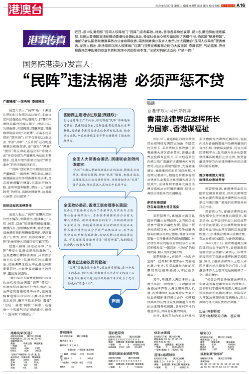 近日,反中乱港组织“民间人权阵线”(“民阵”)宣布解散。对此,香港各界纷纷表示,反中乱港组织的接连解散,反映出香港国安法在推动香港社会由乱及治、稳定社会民心等方面起到了关键作用,确实是“镇港神器”