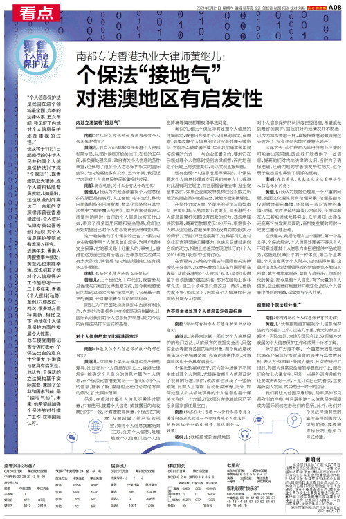 “个人信息保护法是我国在这个领域最全面、完备的法律体系。五六年间,我见证了内地对个人信息保护逐渐重视的过程。” 谈及将于11月1日起施行的《中华人民共和国个人信息保护法》(下称“个保法”),现香港