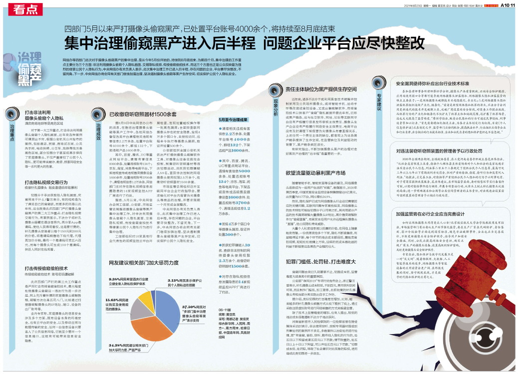据悉,5月以来,中央网信办会同工信部、公安部、市场监管总局推进摄像头偷窥等黑产集中治理工作,对非法利用摄像头偷窥个人隐私画面、交易隐私视频、传授偷窥偷拍技术等侵害公民个人隐私行为进行集中治理。