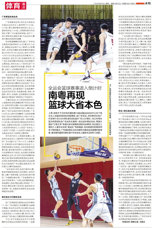 上周,即将于下月中旬开幕的第14届全国运动会对外公布了男女五人制篮球项目的完整赛程,由广东宏远、深圳新世纪和广州龙狮三支CBA球队联合组成的广东U22男队,与以东莞女篮为班底组队的广东成年女篮将一起出战本届全运会。男篮方面的“辽粤之争”有望从职业联赛延续到全运赛场,而女篮五人赛和三人赛中还会有“奥运队”亮相角逐,给本就激烈的竞争带来了新的看点。广东篮坛各队近日也都在为备战全运做着积极准备,毫无疑问篮球比赛会是今年全运会上最受关注的热门话题。