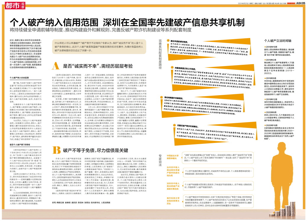 个人破产纳入信用范围 深圳在全国率先建破产信息共享机制
