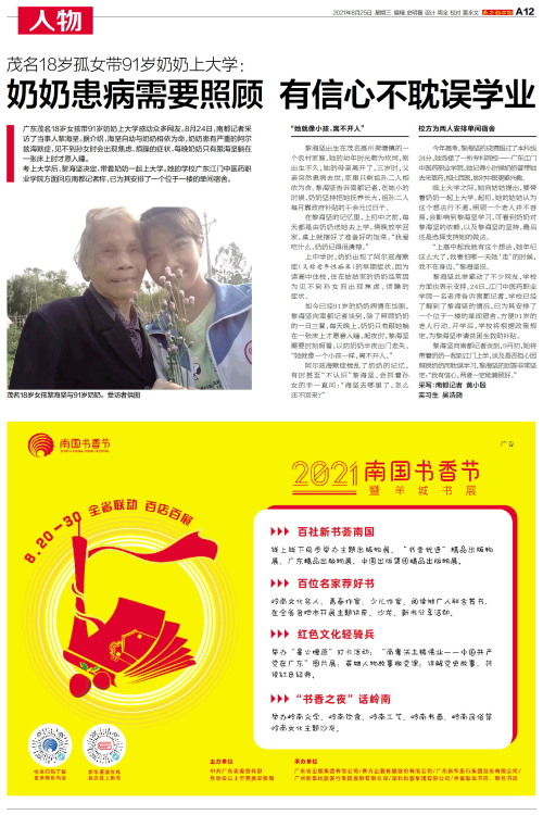 广东茂名18岁女孩带91岁奶奶上大学感动众多网友。8月24日,南都记者采访了当事人黎海坚。据介绍,海坚自幼与奶奶相依为命,奶奶患有严重的阿尔兹海默症,见不到孙女时会出现焦虑、烦躁的症状,每晚奶奶只