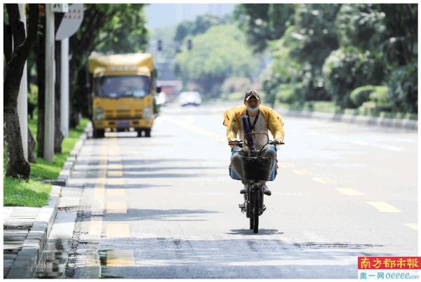 广州,临江大道上。一位快递小哥在酷暑中送货。 南都记者 邹卫 摄