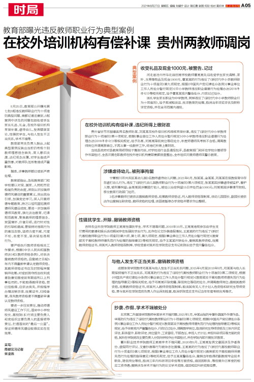8月25日,教育部公开曝光第七批8起违反教师职业行为十项准则典型问题。南都记者注意到,8起案例中涉及的问题包括收受学生家长礼品、礼金,在校外培训机构有偿补课,虐待幼儿,发表错误言论,性骚扰学生,与