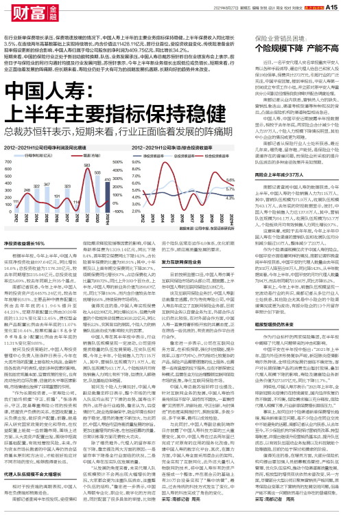 在行业新单保费增长承压、保费增速放缓的情况下,中国人寿上半年的主要业务指标保持稳健。上半年保费收入同比增长3.5%,在连续两年高基数基础上实现持续增长。内含价值达11428.11亿元,居行业首位。