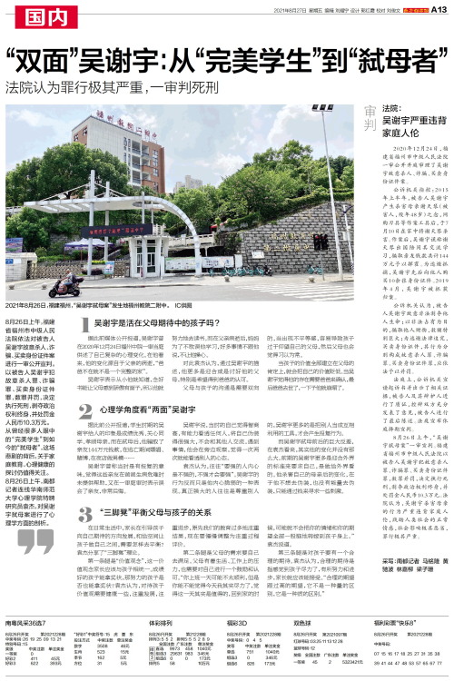8月26日上午,福建省福州市中级人民法院依法对被告人吴谢宇故意杀人、诈骗、买卖身份证件案进行一审公开宣判。以被告人吴谢宇犯故意杀人罪、诈骗罪、买卖身份证件罪,数罪并罚,决定执行死刑,剥夺政治权利终