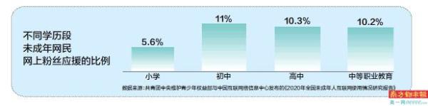 “聚光灯下只一人,打灯台下千万人”。在产业发展的驱动下,良莠不齐的明星不断出现,随之而来的“饭圈”也不断壮大。7月20日,共青团中央维护青少年权益部、中国互联网络信息中心(CNNIC)、中国青少年新媒体协会联合发布的《2020年全国未成年人互联网使用情况研究报告》显示,通过互联网进行粉丝应援成为未成年网民一种新的网上社交与休闲娱乐活动。被调查的所有学历段中,初中生网民在网上进行粉丝应援活动的比例达到11%,高中生网民达10.3%,即使小学生网民也有5.6%。
