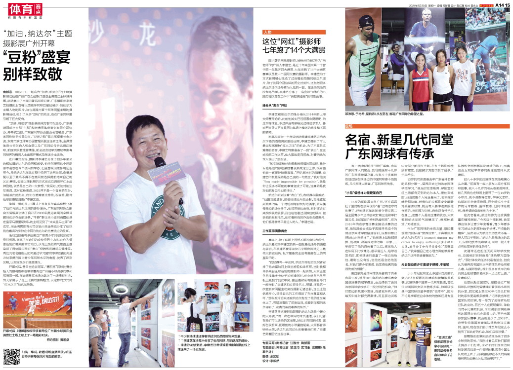 南都讯 8月28日,一场名为“加油,纳达尔”的主题摄影展活动在广州广交会威斯汀酒店金满贯红土球场开幕。活动展出了由国内著名网球记者、广东摄影师李建艺拍摄的上百幅以西班牙网球巨星拉斐尔·纳达尔为主题人物的图片,这也是国内首个网球明星主题的摄影展活动,吸引了众多“豆粉”的关注,也在广东网球圈引起了巨大反响。