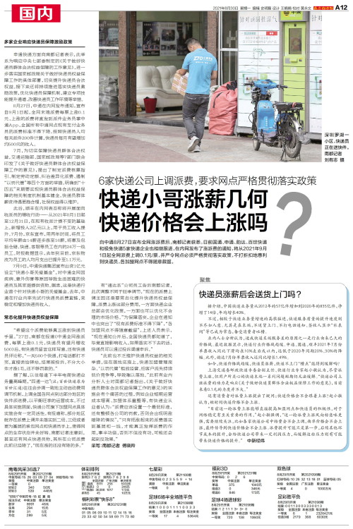 自中通8月27日宣布全网涨派费后,南都记者获悉,日前圆通、申通、韵达、百世快递和极兔快递5家快递企业也相继跟进,在内网发布了涨派费的通知,将从2021年9月1日起全网派费上调0.1元/票,并严令网