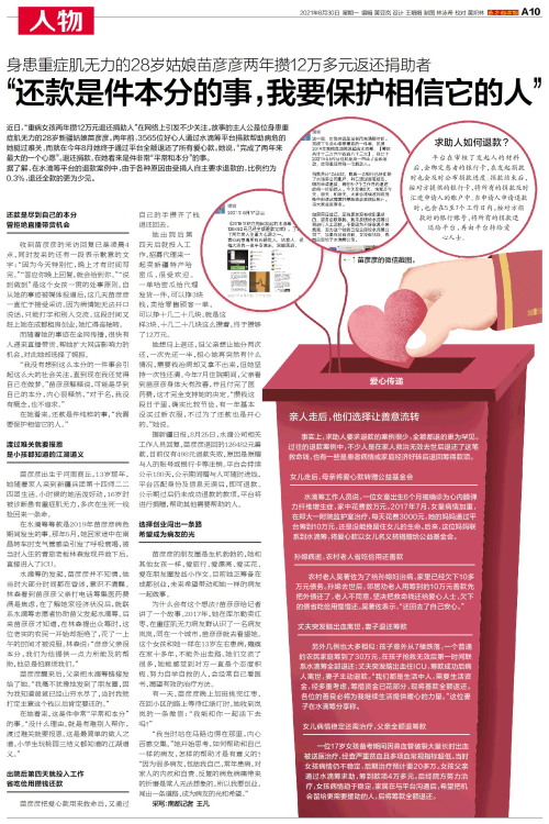 近日,“重病女孩两年攒12万元退还捐助人”在网络上引发不少关注。故事的主人公是位身患重症肌无力的28岁新疆姑娘苗彦彦。两年前,3565位好心人通过水滴筹平台捐款帮助病危的她挺过