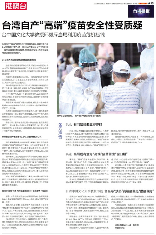 台湾自产“高端”疫苗8月23日开打以来,短短3天已有4人在接种后死亡。这一得到民进党当局大力“护航”却一直争议缠身的新冠疫苗,究竟是否安全,再次引发岛内舆论的质疑与批评。 24日当天两起疑接种高