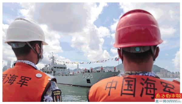 8月25日,驻港部队轮换进港的海军舰艇准备靠岸。新华社发