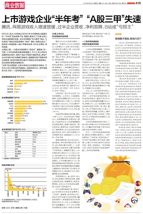 8月31日,各大上市游戏公司2021年半年度报告已披露完毕。“半年考”的成绩单下发,南都记者统计了20家头部公司的业绩数据后发现,与去年同期的“热火朝天”相比,今年游戏厂商的业绩显得格外“克制”:
