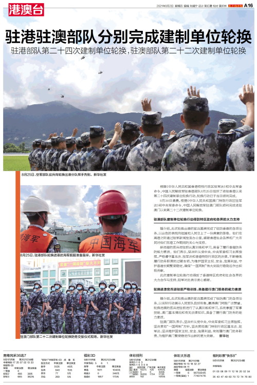 根据《中华人民共和国香港特别行政区驻军法》和中央军委命令,中国人民解放军驻香港部队8月25日组织了进驻香港以来第二十四次建制单位轮换行动,轮换行动已于当日顺利完成。 8月30日清晨,根据《中华人