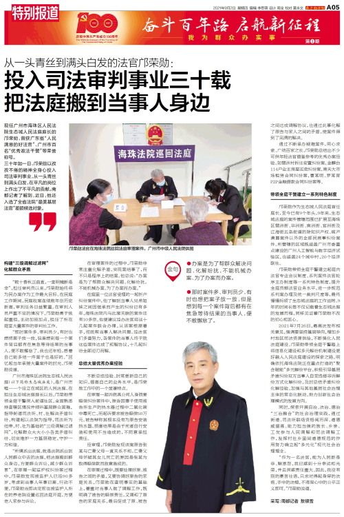 现任广州市海珠区人民法院生态城人民法庭庭长的邝荣勋,曾获广东省“人民满意的好法官”、广州市百名“优秀政法干警”等荣誉称号。三十年如一日,邝荣勋以孜孜不倦的精神全身心投入司法审判事业,从一头青丝到满