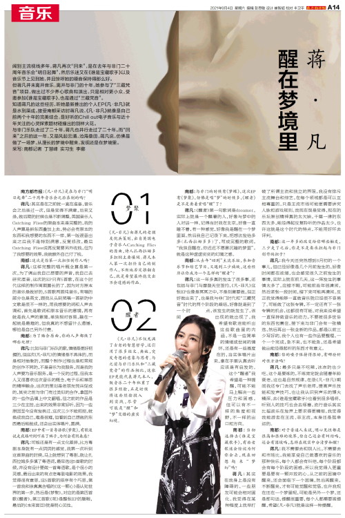 蒋凡:我不需要去和别人比,不需要去和市场比,我能享受自己做喜欢的音乐的那种快乐,每个人都会有纠结,每个阶段都会有每个阶段的困惑,所以我觉得人更重要是要有一颗开放的心。从之前的困境中醒来,还会面临下一个困境,然后再醒来,不断醒来,才有可能觉醒和觉悟。也许我现在还在一个梦里呢,可能是另外一个梦,还是那句话,提醒很重要,每个人都需要被提醒,希望《凡·非凡》就是这样一种提醒。