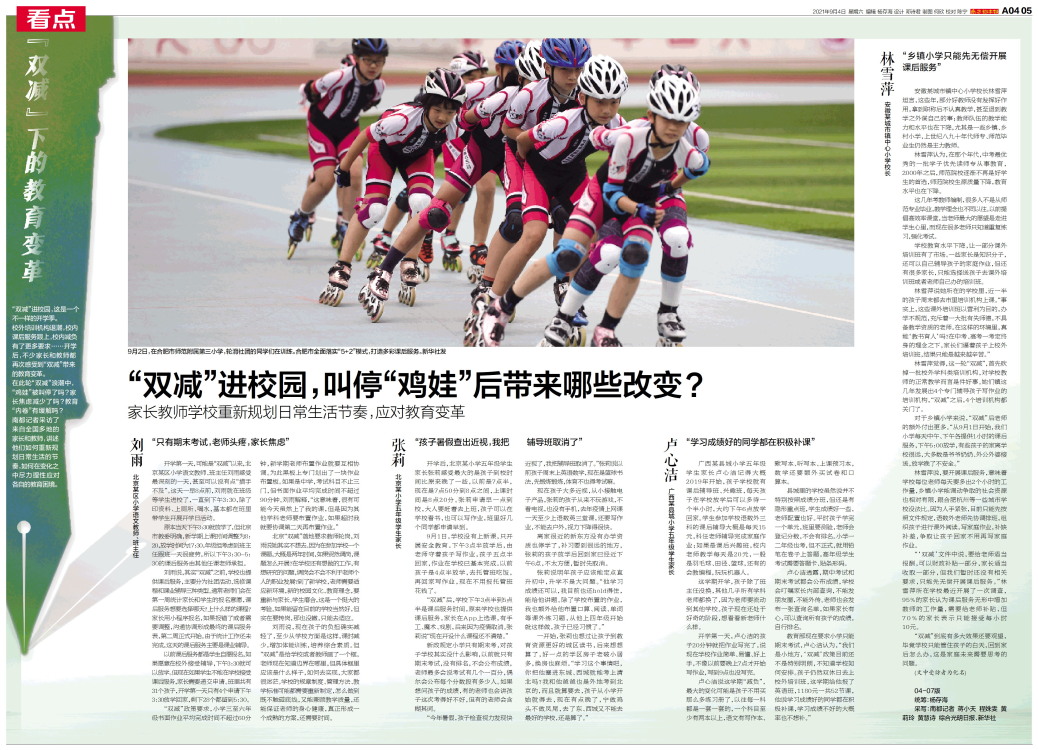 “双减”进校园,这是一个不一样的开学季。校外培训机构退潮,校内课后服务跟上,校内减负有了更多要求……开学后,不少家长和教师都再次感受到“双减”带来的教育变革。在此轮“双减”浪潮中,“鸡娃”被叫停了