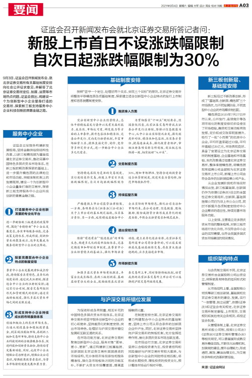 9月3日,证监会召开新闻发布会,就北京证券交易所有关基础制度安排向社会公开征求意见,并解答了北京证券交易所定位、制度、运营等市场热点问题。证监会指出,将建设一个为创新型中小企业量身打造的交易所,探