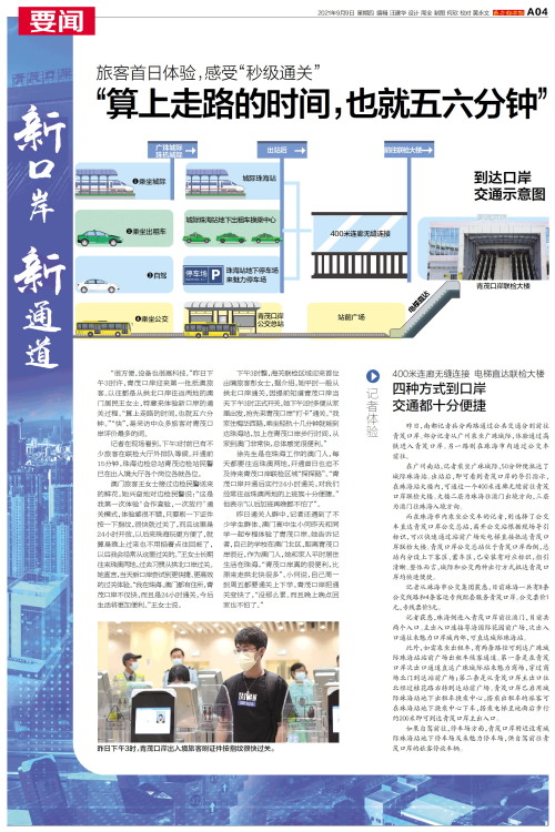 “很方便,设备也很高科技。”昨日下午3时许,青茂口岸迎来第一批抵澳旅客。以往都是从拱北口岸往返两地的澳门居民王女士,特意来体验新口岸的通关过程。“算上走路的时间,也就五六分钟。”“快”,是采访中众