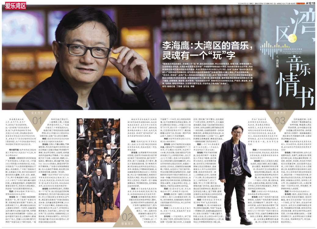 李海鹰:我觉得湾区音乐,灵魂就有一个“玩”字。我以前在曲艺团和粤剧团都待过,现代流行音乐是玩出来的,所以它既创新又非常有生活气息,湾区音乐或者说广东音乐就是生活本身。当然童谣是宝贵财富,2010年广州亚运开幕式,我是音乐总监,就把《落雨大》顶上去了,所有的观众都很高兴,包括外国人,因为这个音乐有广东人的灵性。我鼓励年轻人大胆去做,怎样尝试都可以。另外也不用总是盯着《月光光》和《落雨大》,好的音乐就是生活本身。
