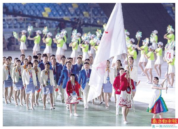 伴随着第十四届全运会会歌的旋律,全运会会旗和第十四届全运会会旗徐徐升起。