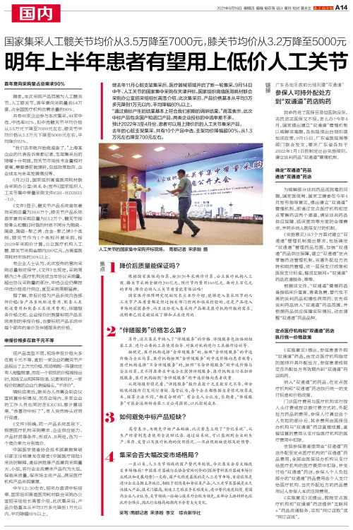继去年11月心脏支架集采后,医疗器械领域开启了新一轮集采。9月14日中午,人工关节的国家集中采购在天津开标。国家组织高值医用耗材联合采购办公室招采组组长高雪介绍,此次集采后,产品价格基本从平均3万