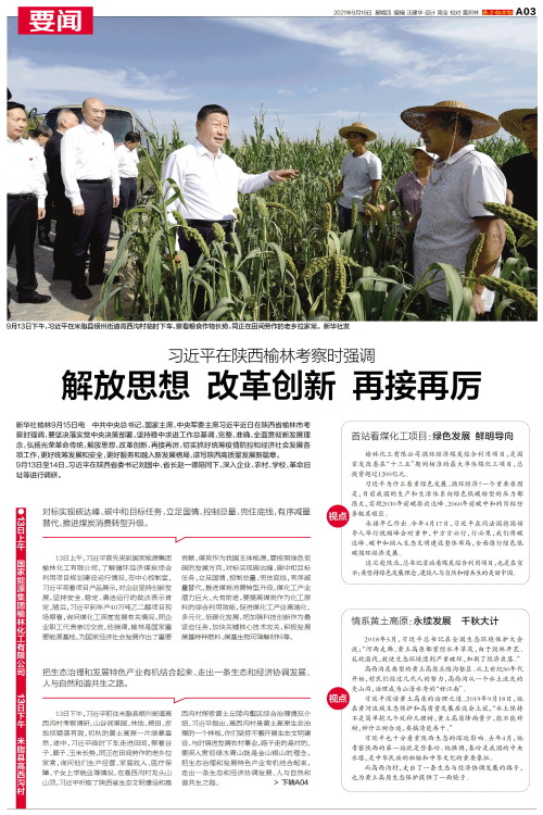 新华社榆林9月15日电 中共中央总书记、国家主席、中央军委主席习近平近日在陕西省榆林市考察时强调,要坚决落实党中央决策部署,坚持稳中求进工作总基调,完整、准确、全面贯彻新发展理念,弘扬光荣革命传统