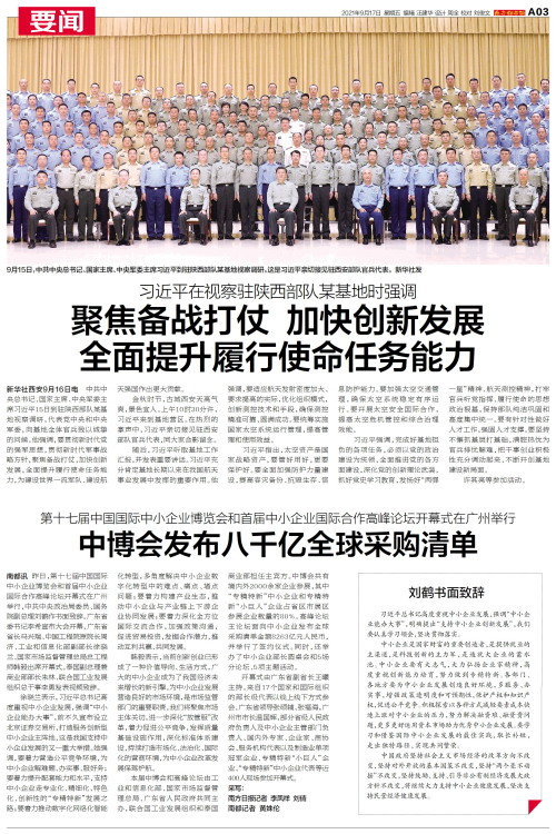 新华社西安9月16日电 中共中央总书记、国家主席、中央军委主席习近平15日到驻陕西部队某基地视察调研,代表党中央和中央军委,向基地全体官兵致以诚挚的问候。他强调,要贯彻新时代党的强军思想,贯彻新时