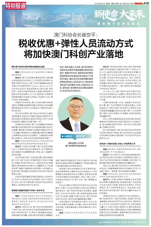 近日,澳区全国人大代表、澳门科学技术协进会会长崔世平接受南都记者专访时表示,随着中共中央、国务院印发《横琴粤澳深度合作区建设总体方案》(以下简称《方案》),通过合作区内更优惠的税务政策及弹性的人员