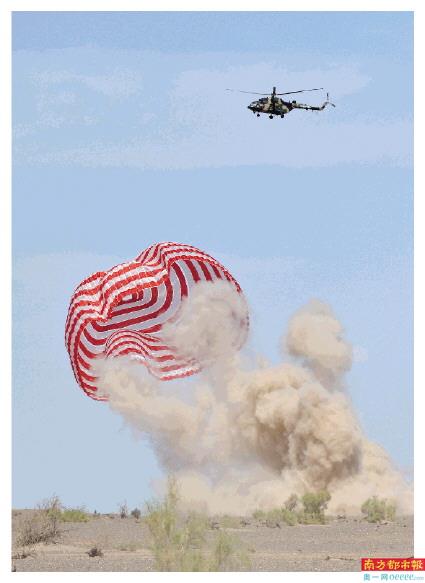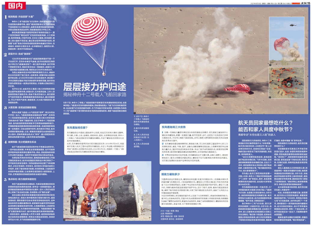 9月17日,神舟十二号载人飞船返回舱在东风着陆场成功着陆。