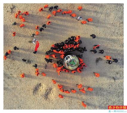 工作人员在对返回舱进行处置(无人机照片)。