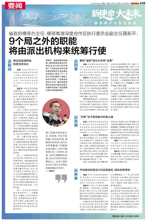 南都讯 随着管理机构揭牌,《横琴粤澳深度合作区建设总体方案》如何落地?广东省派出机构与横琴粤澳深度合作区执委会如何联动、配合?下一步的工作如何展开?聚集上述热点问题,广东省政府横琴办主任、横琴粤澳