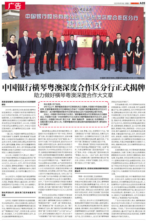 中国银行股份有限公司横琴粤澳深度合作区分行揭牌仪式 珠水潮涌,伶仃澎湃。 9月17日上午,横琴粤澳深度合作区管理机构正式揭牌。中国银行积极响应