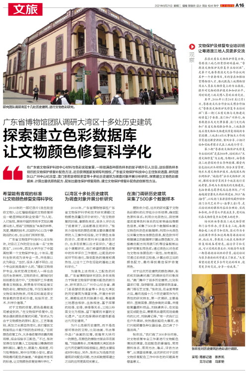 在广东省文物保护科技中心材料与色彩实验室里,一排挂满各种颜色样本的架子格外引人注目。这份颜色样本背后的文物保护修复补配色方法,近日获得国家发明专利授权。广东省文物保护科技中心主任张欢透露,研究团队