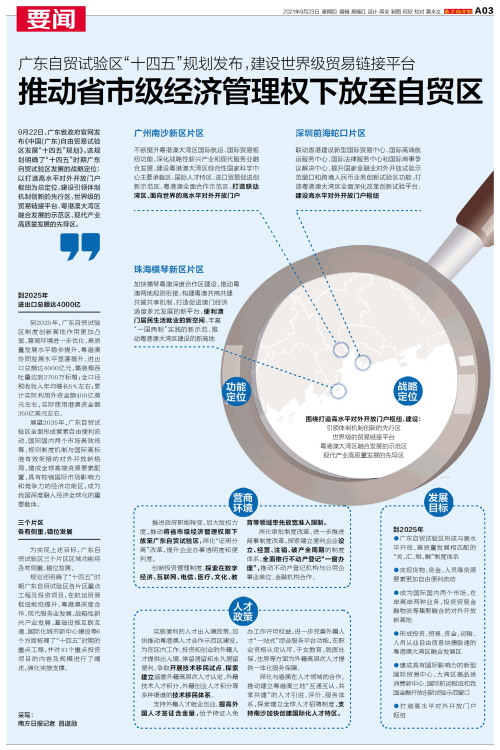 9月22日,广东省政府官网发布《中国(广东)自由贸易试验区发展“十四五”规划》。该规划明确了“十四五”时期广东自贸试验区发展的战略定位:以打造高水平对外开放门户枢纽为总定位,建设引领体制机制创新的
