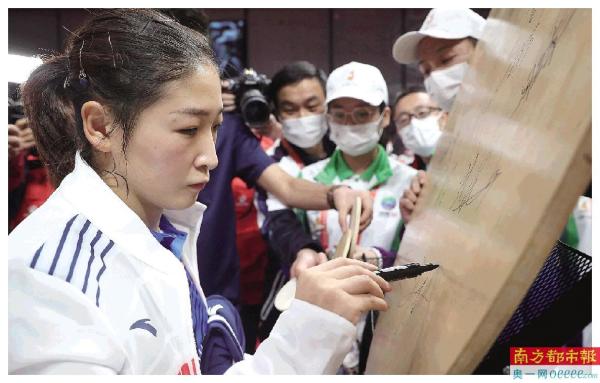 夺得混双金牌后,刘诗雯给球迷签名。新华社发