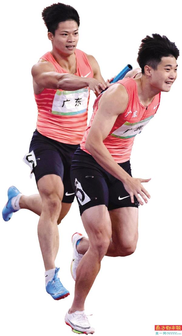 在男子4×200米接力中,苏炳添交棒给张瑞轩。后者在男子200米中获得了第八名。 南都记者 黎湛均 摄