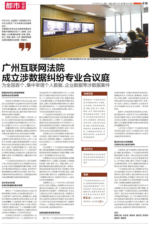 9月26日,全国首个涉数据纠纷专业合议庭在广州互联网法院揭牌成立。涉数据纠纷专业合议庭将审理由该院集中管辖的涉及个人数据、企业数据、公共数据的收集、存储、使用、加工、传输、提供、公开、删除等数据处