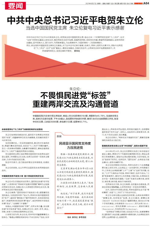 中共中央总书记习近平26日致电朱立伦,祝贺其当选中国国民党主席,指出过去一个时期两党在坚持“九二共识”、反对“台独”共同政治基础上良性互动,推动两岸关系和平发展,造福两岸同胞,成效有目共睹。期望两