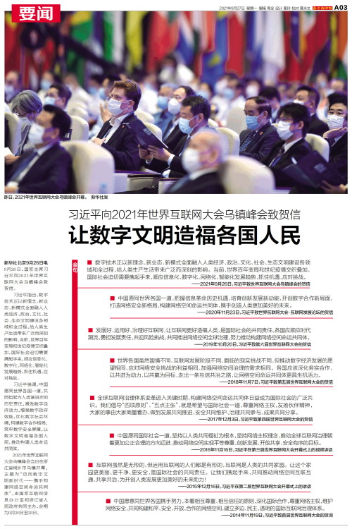 新华社北京9月26日电9月26日,国家主席习近平向2021年世界互联网大会乌镇峰会致贺信。 习近平指出,数字技术正以新理念、新业态、新模式全面融入人类经济、政治、文化、社会、生态文明建设各领域和
