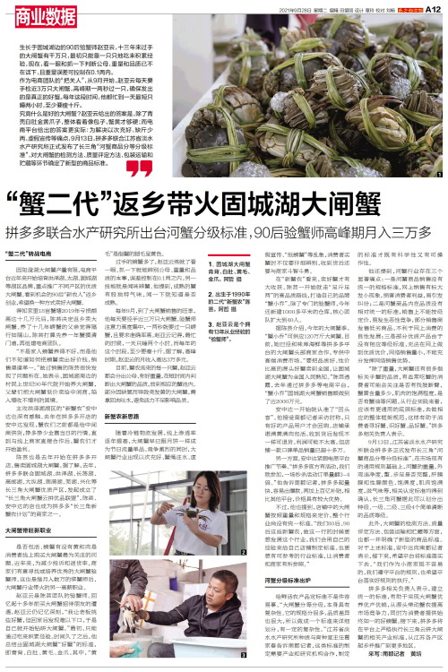 生长于固城湖边的90后验蟹师赵亚云,十三年来过手的大闸蟹有千万只,最初只能靠一只只地吃来积累经验,现在,看一眼和抓一下判断公母、重量和品质已不在话下,且重量误差可控制在0.1两内。作为电商团队的“