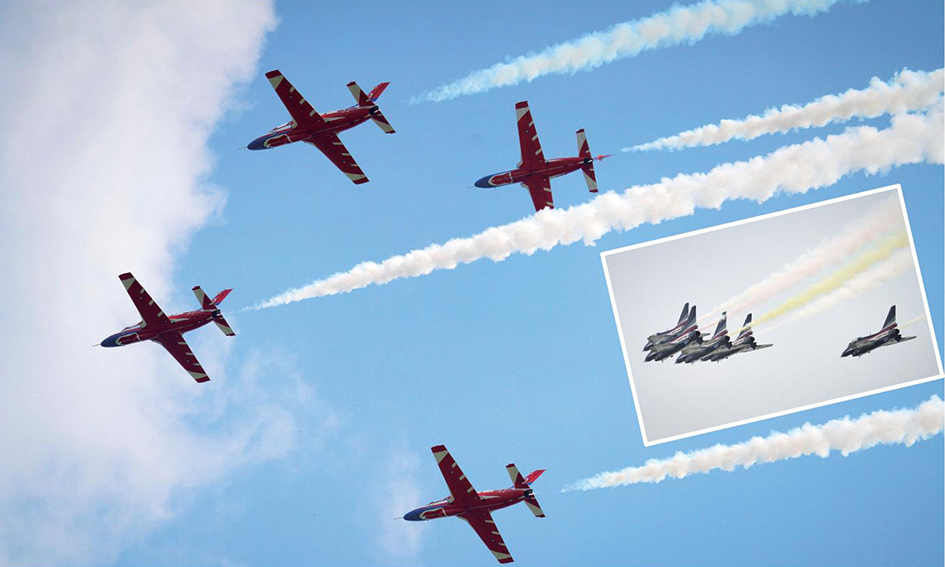 特技飞行表演历来是航展中最受瞩目的一大看点,但与航展前两天不同,昨日的飞行表演有着特殊的意味。上午11时22分许,伴随一阵阵轰鸣声,“八一”飞行表演队的战机似离弦之箭,依次冲上云霄,在航展馆上空奉献了一出精彩绝伦的“蓝天芭蕾”:多架歼-10战机或单独飞行,或组成编队,时而箭队、时而楔队、时而筋斗,上演“倒挂金钟”、“向上开花”,引得现场观众叫好连连。