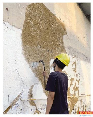 刘锡龙介绍,过去创作的墙体用刮刀轻轻一刮,里面黑色的水泥就露出来了,比较容易“成像”。而这一次选择的墙体表面太硬,他曾用得顺手的镰刀、锤子、抹布、钢丝刷和刮刀都派不上用场。刘锡龙灵光一闪,借来了专门用于混凝土面打孔的电钻来创作。