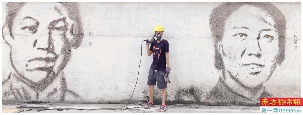 这幅百米墙绘出自“90后”广告人刘锡龙之手。他告诉南都记者,这是他第一次尝试用电钻来雕刻人物肖像。在“动工”之前,刘锡龙先根据史料在电脑上对画面进行整体布局,再对具体人物形象进行设计。
