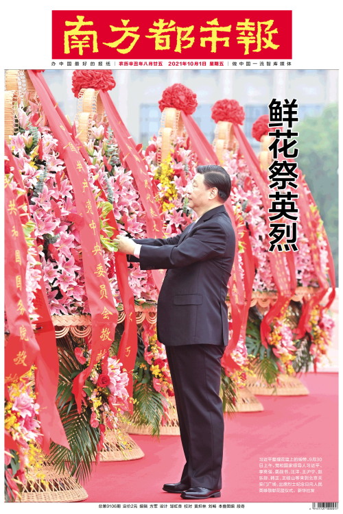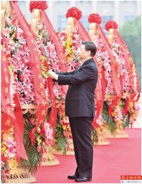 习近平整理花篮上的缎带。9月30日上午,党和国家领导人习近平、李克强、栗战书、汪洋、王沪宁、赵乐际、韩正、王岐山等来到北京天安门广场,出席烈士纪念日向人民英雄敬献花篮仪式。 新华社发