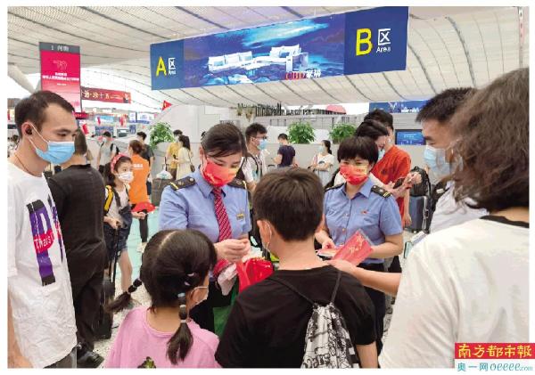 深圳北站迎春花服务队、党员突击队给旅客派发小国旗和口罩。 通讯员供图